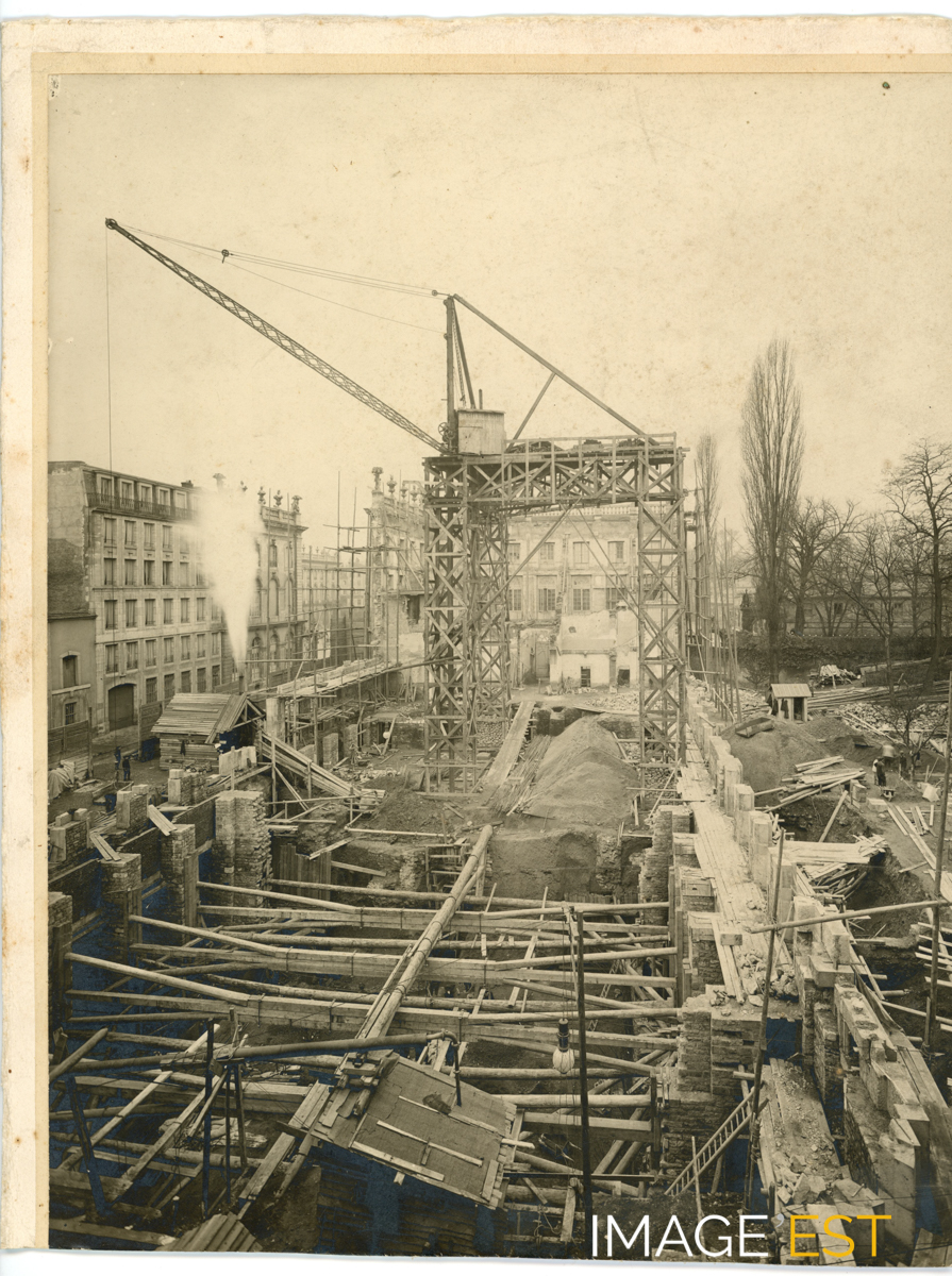 Chantier de recontruction du Théâtre place Stanislas à Nancy (Meurthe-et-Moselle). L'ancien Théâtre de la Comédie, construit en 1755 qui occupait autrefois le bâtiment de l'actuel Musées des Beaux-Arts place Stanislas, fut anéanti par l'incendie du 6 octobre 1906. Si sa reconstruction fut immédiatement décidée, de longues polémiques s'engagèrent et retardèrent le projet. La Loi de Séparation de l'Église et de l'État en 1905 ouvre de nouvelles perspectives et en 1909, l'ancien Hôtel des Fermes, propriété de l'Évêché, devient une propriété de l'État. L'on sait que le concours de 1906, quant au choix de l'architecte, privilégia le projet de Joseph Hornecker au détriment du nancéien, Émile André. C'est en août 1910 que commencent les travaux. Le nouveau théâtre sera inauguré le 14 octobre 1919. On remarquera au centre, l'inscription de l'entreprise figurant sur la grue " France Lanord & Bichaton entrepreneur ".
