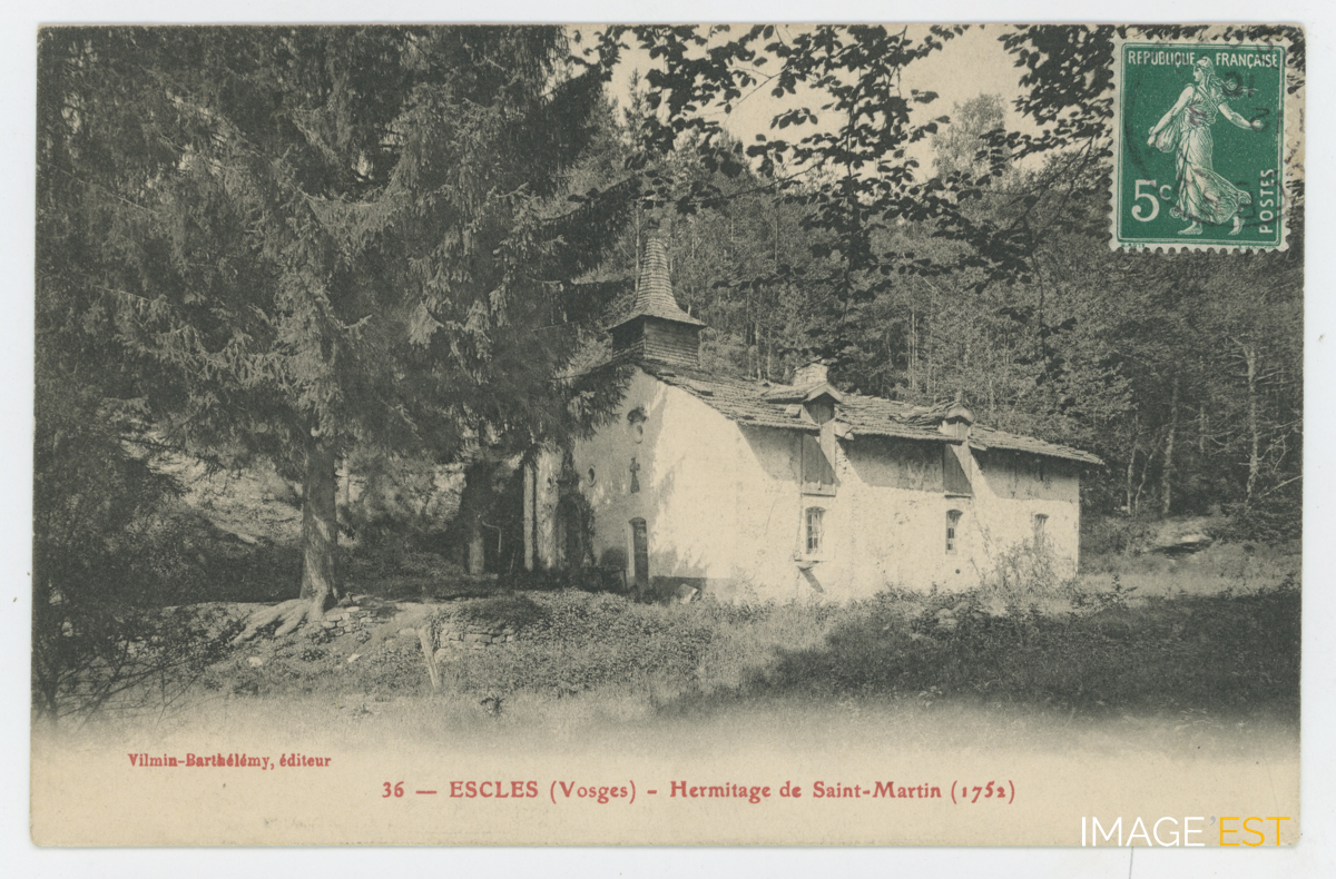 Chapelle Saint-Martin à Escles (Vosges) avant sa démolition en 1937. La légende précise : " Hermitage de Saint-Martin (1752) ".