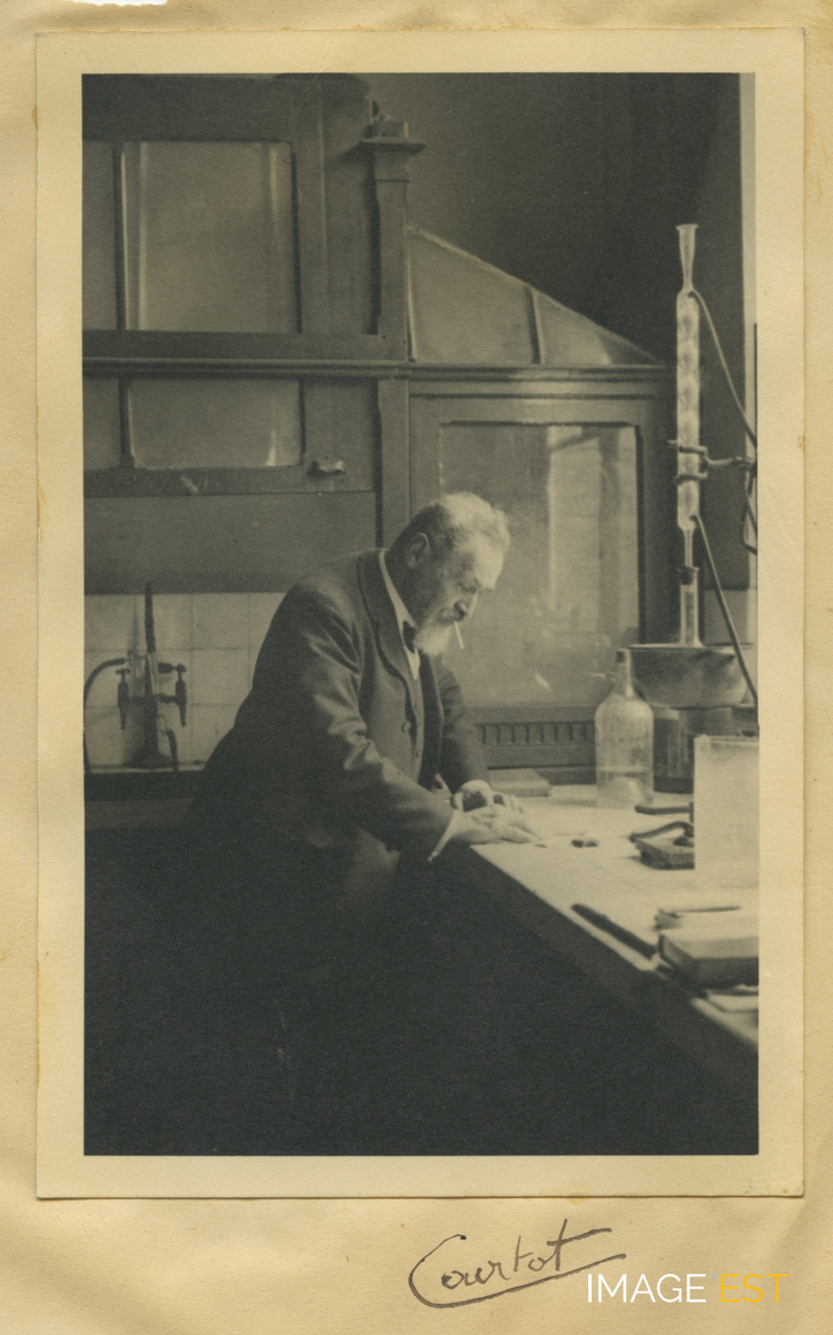 Portrait de Charles Courtot (1888-1955). " Charles Hippolyte Courtot est né le 7 mars 1888 à Besançon. Son père, Pierre Séraphin Courtot, exerce la profession de limonadier et sa mère Maria Parrenin est sans profession. Il épouse le 20 septembre 1913 à Besançon, Marie-Thérèse Fisher, employée de commerce. Courtot fait ses études au lycée de Besançon, où il obtient le baccalauréat en 1907. Il entre ensuite à la faculté des sciences de la ville et il est licencié ès sciences en 1909, avec trois certificats (minéralogie, chimie générale, chimie industrielle). Il passe en outre, à la Faculté des sciences de Nancy en 1912, le certificat de Physique. En 1915, il soutient sa thèse intitulée Études sur la série des fulvènes, sous la direction de Victor Grignard. En décembre 1909 il est nommé à l'Institut chimique de Nancy délégué dans les fonctions de préparateur de chimie organique sur un poste financé par les excédents des droits de travaux pratiques ; il remplace alors René Romann. En 1912, il remplace Louis Bonnet sur un poste de préparateur à l'Institut chimique, nomination qui stabilise sa position. Il conserve ce poste jusqu'en 1916 et parallèlement, d'avril 1915 à juillet 1916, il est chargé d'un cours de chimie organique et de chimie tinctoriale. " (Source : https://histoire-universite-nancy.fr/s/una2gm/item/1066).