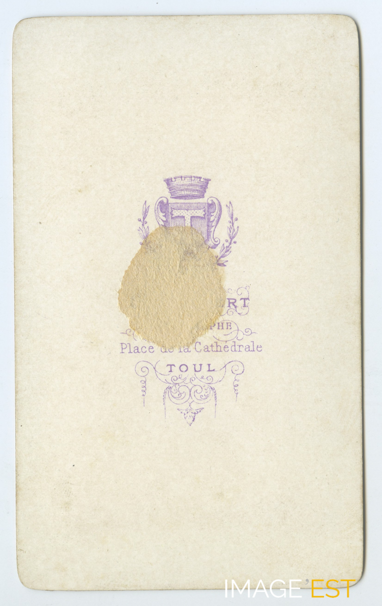 Portrait-carte de visite du photographe Charles Gilbert installé à Toul (Meurthe-et-Moselle). Cette photographie est extraite d'un album contenant des portraits de nombreux prêtres ayant exercés dans le département des Vosges entre 1870 et 1910 environ.