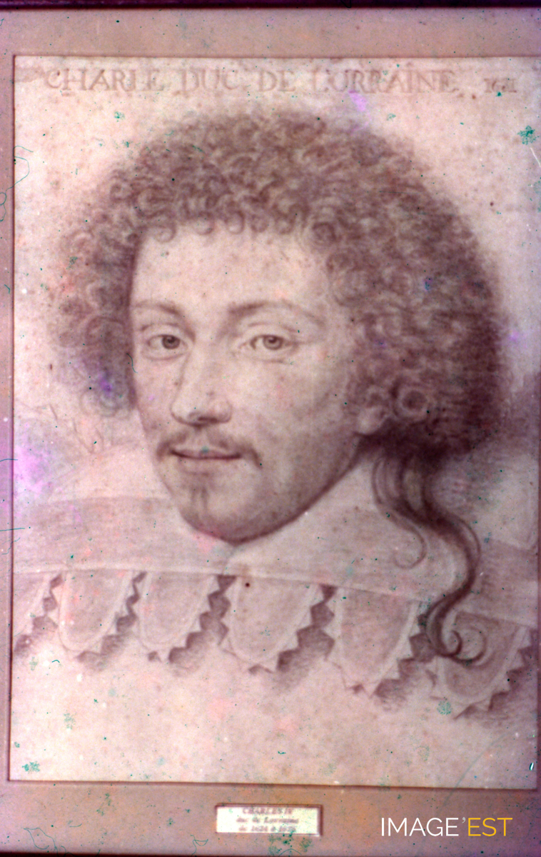 La Lorraine et la guerre de Trente ans. Portrait au crayon du duc de Lorraine Charles IV (1625-1675). En marge de la diapositive figure la mention : " 1. Charles IV duc de Lorraine (1631) ". Séries de diapositives sélectionnées et commentées par Jean Hurstel, directeur du Service éducatif des Musées de l'Académie de Nancy-Metz.