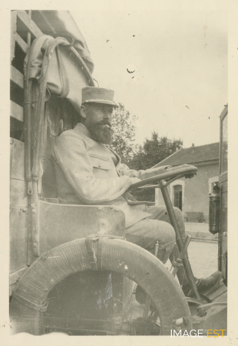 Charles Kalis (1876-1944), entrepreneur à Nancy (Meurthe-et-Moselle), au volant d'un véhicule militaire pendant la Première Guerre mondiale. (Source : Archives privées des familles Kalis-Moreau).