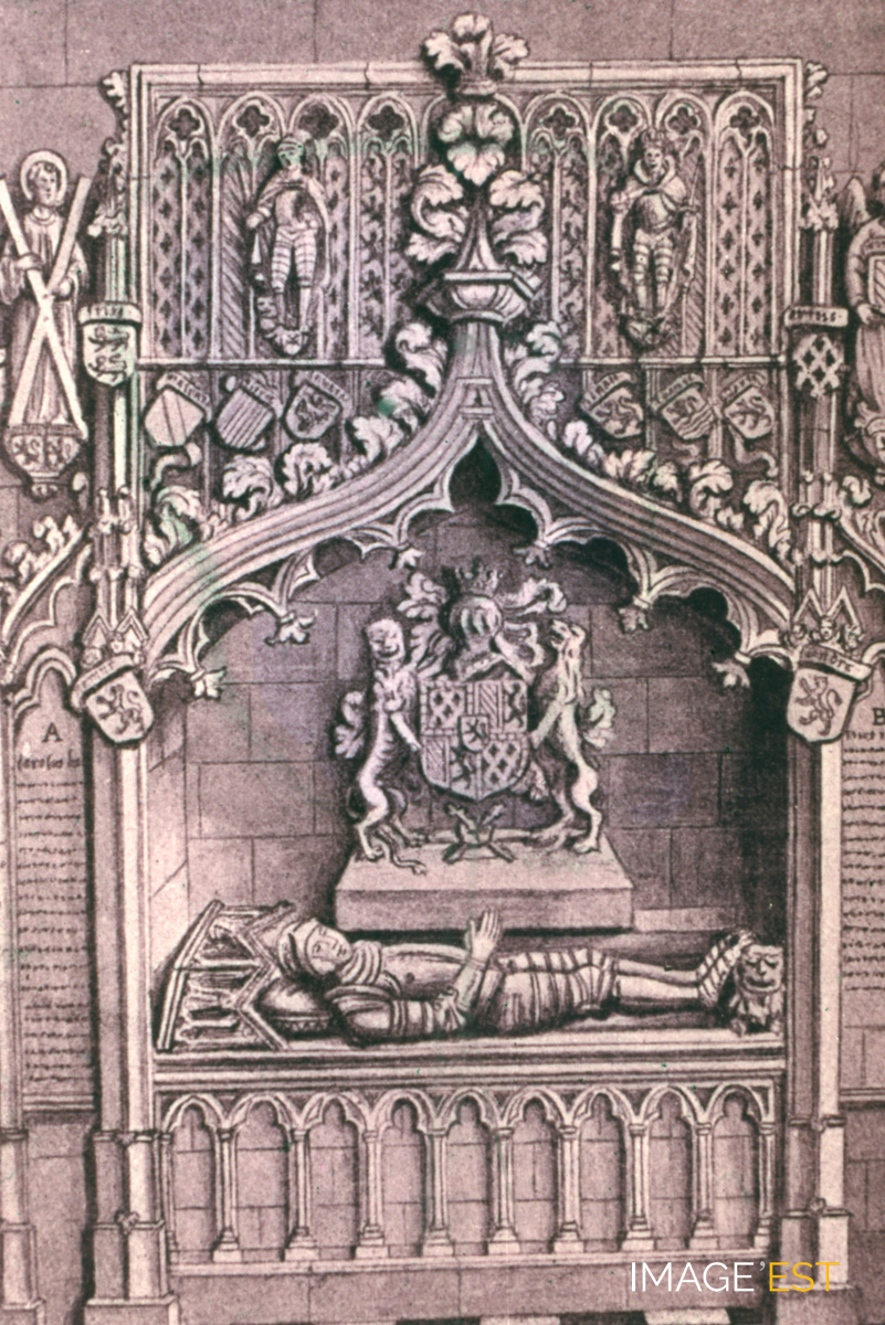 La bataille de Nancy (1477). Un dessin de Palliot (1608-1698) de la fin du XVIIe représentant le tombeau de Charles le Téméraire. En marge de la diapositive figure la mention : " 7. Tombeau de Charles le Téméraire par Jean Crocq. Vers 1500. Dessin de Palliot (XVIIe siècle) ". Séries de diapositives sélectionnées et commentées par Jean Hurstel, directeur du Service éducatif des Musées de l'Académie de Nancy-Metz.