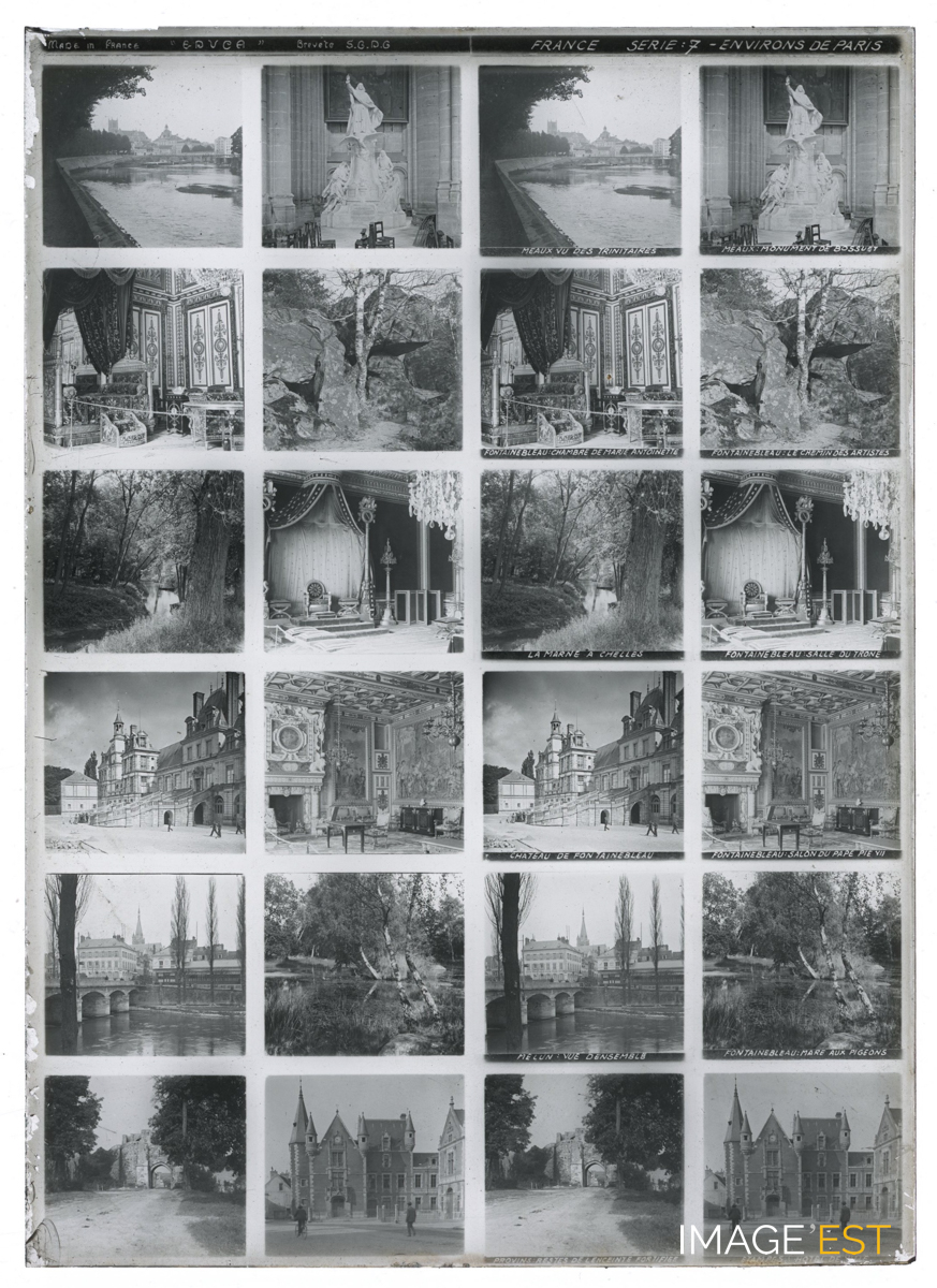 Série de 24 vues montrant le monument de Bossuet à l'intérieur de la cathédrale de Meaux, le château de Fontainebleau, la Marne à Chelles, les restes de l'enceinte fortifiée à Provins (Seine-et-Marne), l'hôtel de ville à Etampes (Essonne). Une mention manuscrite en haut de la plaque indique : " Made in France " Educa " - Breveté S.G.D.G France Série 7 - environs de Paris ". Une annotation figure sous certaines vues : " Meaux vu des trinitaires - Meaux : monument de Bossuet - Fontainebleau : chambre de Marie-Antoinette - Fontainebleau : le chemin des artistes - La Marne à Chelles - Fontainebleau : salle du trône - Château de Fontainebleau - vue d'ensemble Fontainebleau : salon du pape Pie VIII - Melun : vue d'ensemble - Fontainebleau : mare aux pigeons - Provins : reste de l'ensemble fortifiée - Etampes : hôtel de ville ". Il pourrait s'agir d'une plaque destinée a être visionnée dans le domaine de l'Education. (Ecole de Danne et Quatre vents (Moselle). Sur chaque plaque de verre, on trouve deux colonnes doubles de six photographies stéréoscopiques placées en rangée. Concernant les plaques stéréoscopiques, on peut s'interroger sur la nature des représentations véhiculées par l'intermédiaire de la collection la plus diffusée, à savoir la Géographie illustrée de la France. Chaque vue stéréoscopique possède sa propre légende inscrite dans la partie inférieure, et chaque plaque intègre en son milieu son numéro de série et son intitulé. (Source : Nicolas Le Guern, « La stéréoscopie dans les salles de classe. Le cas du stéréoscope Educa dans la France de l'entre-deux-guerres », Transbordeur [En ligne], 8 | 2024, mis en ligne le 15 février 2025, consulté le 28 octobre 2025. URL : http://journals.openedition.org/transbordeur/1456 ; DOI : https://doi.org/10.4000/12gy7).
