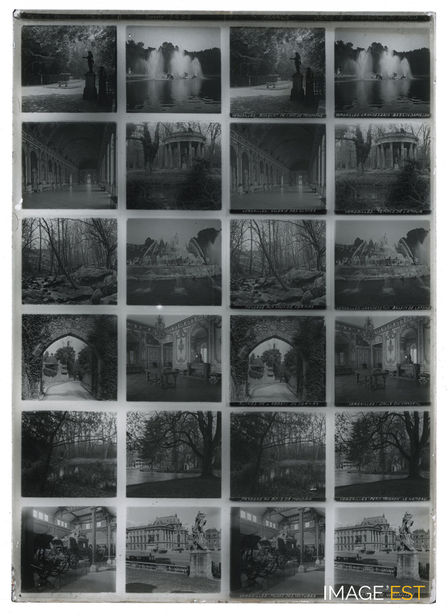 Série de 24 vues montrant le parc du bosquet, les grandes eaux des bassins d'Apollon et de Latone , la galerie des glaces, le temple de l'amour, la salle du conseil, le petit trianon et le musée du château de Versailles ainsi que la forêt et les ruines de l'abbaye de Cernay (Vaux de Cernay) (Yvelines) et le bois de Meudon (Hauts-de-Seine). Une mention manuscrite en haut de la plaque indique : " Made in France "Educa" - Breveté S.G.D.G France Série 6 - Environs de Paris. Une annotation figure sous certaines vues : " Versailles : bosquet de l'arc de triomphe - Versailles : grandes eaux : bassin d'Apollon - Versailles : galerie des glaces - Versailles : temple de l'amour - Paysage aux vaux de Cernay - Versailles : grandes eaux : bassin de Latone - Ruines de l'abbaye de Cernay - Versailles : salle du conseil - Paysage du bois de Meudon - Versailles - petit trianon : le hameau - Versailles : musée des voitures - le château de Versailles ". Il pourrait s'agir d'une plaque destinée a être visionnée dans le domaine de l'Education. (Ecole de Danne et Quatre vents (Moselle). Sur chaque plaque de verre, on trouve deux colonnes doubles de six photographies stéréoscopiques placées en rangée. Concernant les plaques stéréoscopiques, on peut s'interroger sur la nature des représentations véhiculées par l'intermédiaire de la collection la plus diffusée, à savoir la Géographie illustrée de la France. Chaque vue stéréoscopique possède sa propre légende inscrite dans la partie inférieure, et chaque plaque intègre en son milieu son numéro de série et son intitulé. (Source : Nicolas Le Guern, « La stéréoscopie dans les salles de classe. Le cas du stéréoscope Educa dans la France de l'entre-deux-guerres », Transbordeur [En ligne], 8 | 2024, mis en ligne le 15 février 2025, consulté le 28 octobre 2025. URL : http://journals.openedition.org/transbordeur/1456 ; DOI : https://doi.org/10.4000/12gy7).