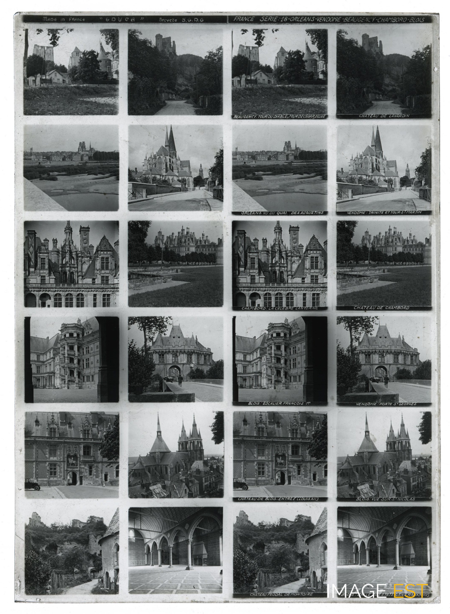 Série de 24 vues montrant différents châteaux regroupés sous l'appellation touristique des châteaux de la Loire et Orléans (Loiret), vue du quai des Augustins. Une mention manuscrite en haut de la plaque indique : " Made in France " Educa " - Breveté S.G.D.G France Série 18 - Orléans - Vendôme - Beaugency - Chambord - Blois ". Une annotation figure sous certaines vues : " Beaugency : tour du diable, tour de César, église - Château de Lavardin - Orléans vu du quai des Augustins - Vendôme : trinité et tour St-Martin - Chambord : la célèbre lanterne - Château de Chambord - Blois : escalier François 1er - Vendôme : porte St-Georges - Château de Blois : entrée (Louis XII) - Blois : vue St-Nicolas - Château féodal de Montoire - Blois : salle des États Généraux XIIIe Sc ". On peut remarquer l'escalier monumental du château de Blois couvert de fines sculptures de style Renaissance, d'ornements italianisants (statues, balustres, candélabres) et d'emblèmes royaux (salamandres, couronnes, « F » pour François Ier, « C » pour Claude de France), s'ouvre entre les contreforts par de larges baies sur la cour du château. (https://fr.wikipedia.org/wiki/Ch%C3%A2teau_de_Blois). Il pourrait s'agir d'une plaque destinée a être visionnée dans le domaine de l'Education. (École de Danne et Quatre vents (Moselle). Sur chaque plaque de verre, on trouve deux colonnes doubles de six photographies stéréoscopiques placées en rangée. Concernant les plaques stéréoscopiques, on peut s'interroger sur la nature des représentations véhiculées par l'intermédiaire de la collection la plus diffusée, à savoir la Géographie illustrée de la France. Chaque vue stéréoscopique possède sa propre légende inscrite dans la partie inférieure, et chaque plaque intègre en son milieu son numéro de série et son intitulé. (Source : https://journals.openedition.org/transbordeur/1456). (Source : Nicolas Le Guern, « La stéréoscopie dans les salles de classe. Le cas du stéréoscope Educa dans la France de l'entre-deux-guerres », Transbordeur [En ligne], 8 | 2024, mis en ligne le 15 février 2025, consulté le 28 octobre 2025. URL : http://journals.openedition.org/transbordeur/1456 ; DOI : https://doi.org/10.4000/12gy7).