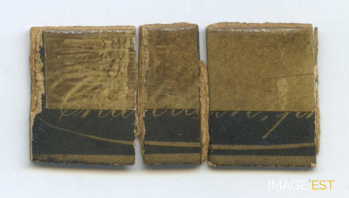Trois morceaux de papier albuminé contrecollés sur carton qui, assemblés, forment la signature suivante " Chatelain ". Il pourrait s'agir de Céline Chatelain (1833-1908), photographe professionnelle, active sur Nancy de 1848 à 1898 et considérée comme la doyenne des photographes nancéiens. Ces trois morceaux sont à associer à une vue qui représente l'ancienne église de Maxéville (Meurthe-et-Moselle) (voir FI-0683-0797 et FI-0683-0798), prise alors que son dernier atelier se trouvait au 24, rue de Boudonville à Nancy durant la période 1872-1898.