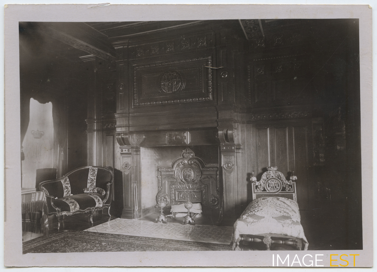 Cheminée d'un château avec méridienne et petit lit, probablement de la maison de Bauffremont dans le département des Vosges. Ancienne famille de noblesse féodale, originaire de Lorraine, la maison de Bauffremont possédait des terres près de Neufchâteau (Vosges). Cette photographie est extraite d'un album en cuir repoussé comprenant un ensemble de 48 photographies (format 13 x 18 cm), noir et blanc, illustrant les loisirs et la vie d'une famille aisée probablement dans le département des Vosges à la fin du XIXe ou au début du XXe siècle.