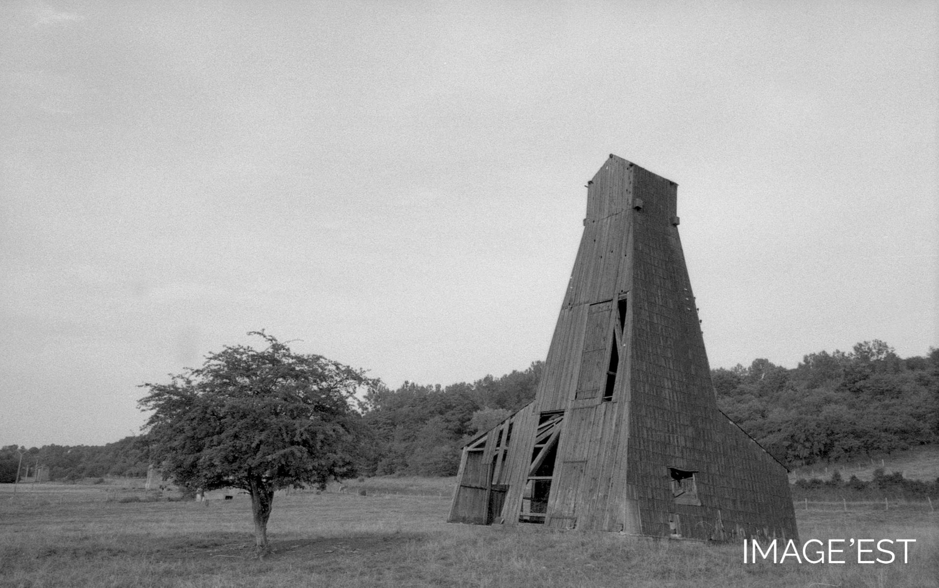 Chevalement de puits de sel servant à l'installation des forages et à l'exploitation par pompage de la saumure, dans la vallée de la Roanne, sur la commune de Lenoncourt (Meurthe-et-Moselle). Dans cette vallée de la Roanne, se trouvaient en 1958, une trentaine d'installations dont quatre grands chevalements.