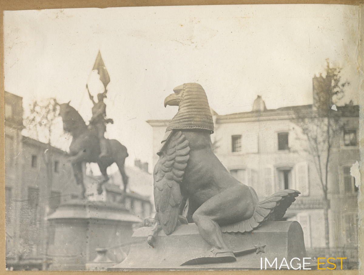 Chimère et statue équestre de Jeanne d'Arc, oeuvre du sculpteur Émmanuel Frémiet (1824-1910) située square La Fayette (actuelle place Jeanne d'Arc) à Nancy (Meurthe-et-Moselle) et inaugurée le 28 juin 1890. C'est en 1913 qu'a lieu l'aménagement définitif de cette place, réalisé grâce au legs de M. Osiris sur un plan de l'architecte municipal Jasson. L'entrée du square est encadré par deux chimères en bronze d'après les modèles du château de Pierrefonds moulés par Bussière (https://e-monumen.net/patrimoine-monumental/monument-a-jeanne-darc-place-jeanne-darc-nancy). Les deux chimères en bronze (un aigle et un lézard) disparaissent en 1943, remplacées par deux vasques en pierre.