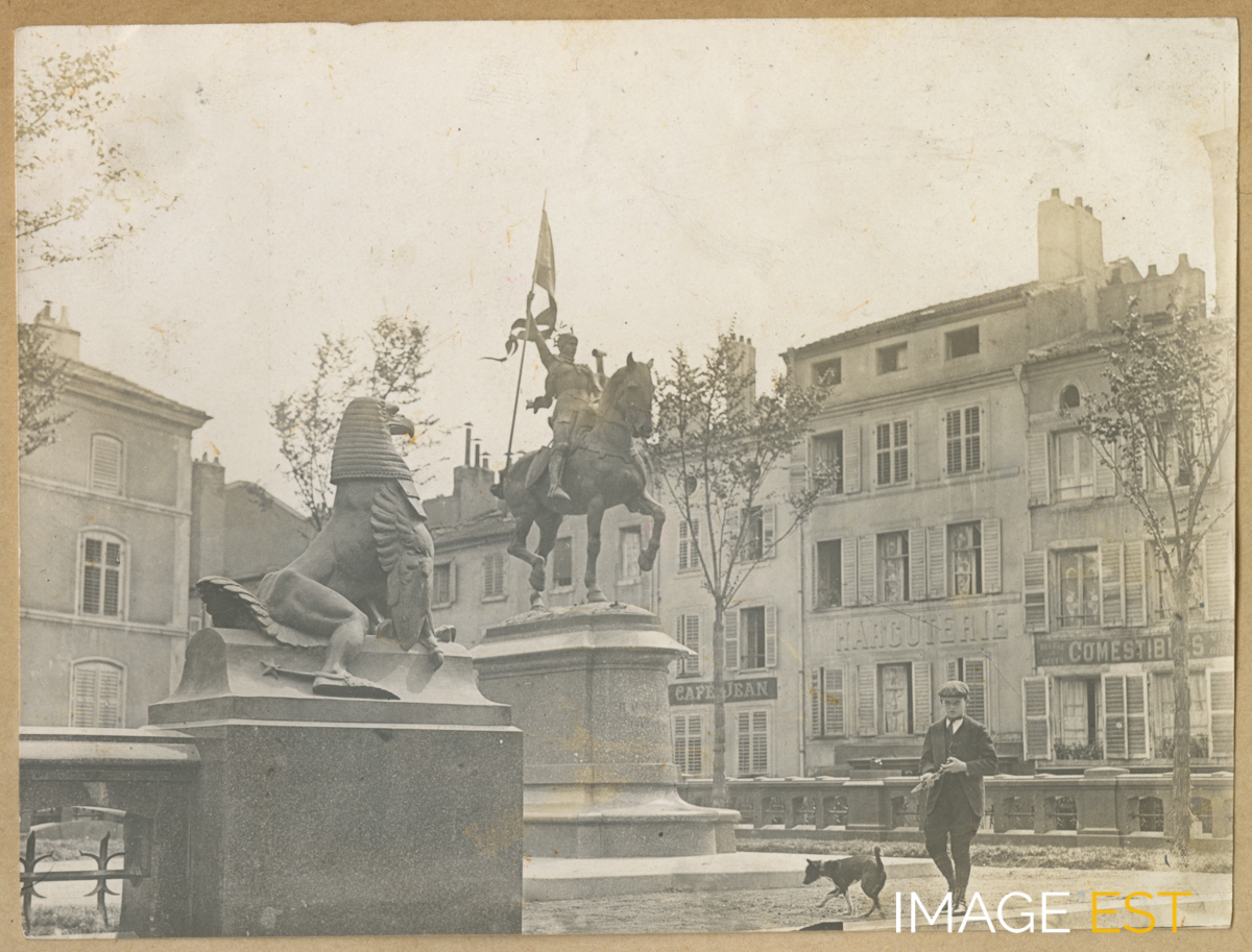 Chimère et statue équestre de Jeanne d'Arc, oeuvre du sculpteur Émmanuel Frémiet (1824-1910) située square La Fayette (actuelle place Jeanne d'Arc) à Nancy (Meurthe-et-Moselle) et inaugurée le 28 juin 1890. C'est en 1913 qu'a lieu l'aménagement définitif de cette place, réalisé grâce au legs de M. Osiris sur un plan de l'architecte municipal Jasson. L'entrée du square est encadré par deux chimères en bronze d'après les modèles du château de Pierrefonds moulés par Bussière (https://e-monumen.net/patrimoine-monumental/monument-a-jeanne-darc-place-jeanne-darc-nancy). Les deux chimères en bronze (un aigle et un lézard) disparaissent en 1943, remplacées par deux vasques en pierre.