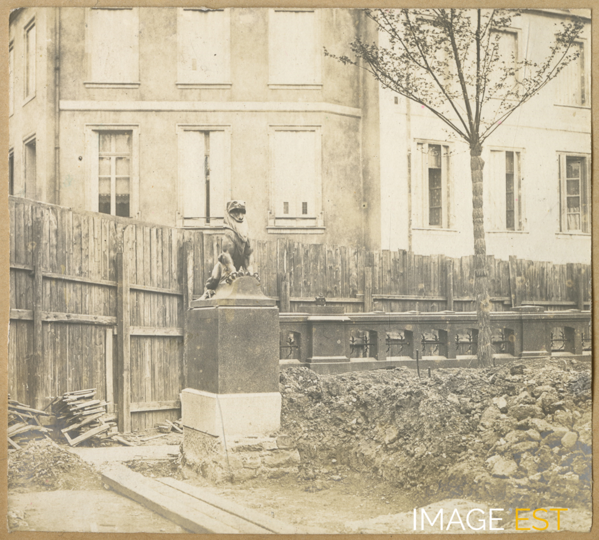 Chimère implantée square La Fayette (actuelle place Jeanne d'Arc) à Nancy (Meurthe-et-Moselle). En 1913, l'aménagement définitif de cette place est réalisé grâce au legs de M. Osiris sur un plan de l'architecte municipal Jasson. L'entrée du square est encadré par deux chimères en bronze d'après les modèles du château de Pierrefonds moulés par Bussière " (https://e-monumen.net/patrimoine-monumental/monument-a-jeanne-darc-place-jeanne-darc-nancy). Les deux chimères en bronze (un aigle et un lézard) disparaissent en 1943, remplacées par deux vasques en pierre.
