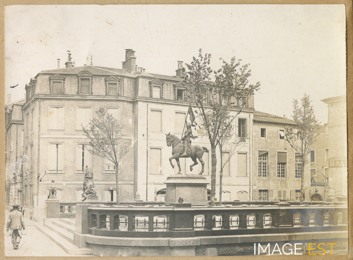 Chimères et statue équestre de Jeanne d'Arc, oeuvre du sculpteur Émmanuel Frémiet (1824-1910) située square La Fayette (actuelle place Jeanne d'Arc) à Nancy (Meurthe-et-Moselle) et inaugurée le 28 juin 1890. C'est en 1913 qu'a lieu l'aménagement définitif de cette place, réalisé grâce au legs de M. Osiris sur un plan de l'architecte municipal Jasson. L'entrée du square est encadré par deux chimères en bronze d'après les modèles du château de Pierrefonds moulés par Bussière (https://e-monumen.net/patrimoine-monumental/monument-a-jeanne-darc-place-jeanne-darc-nancy). Les deux chimères en bronze (un aigle et un lézard) disparaissent en 1943, remplacées par deux vasques en pierre.