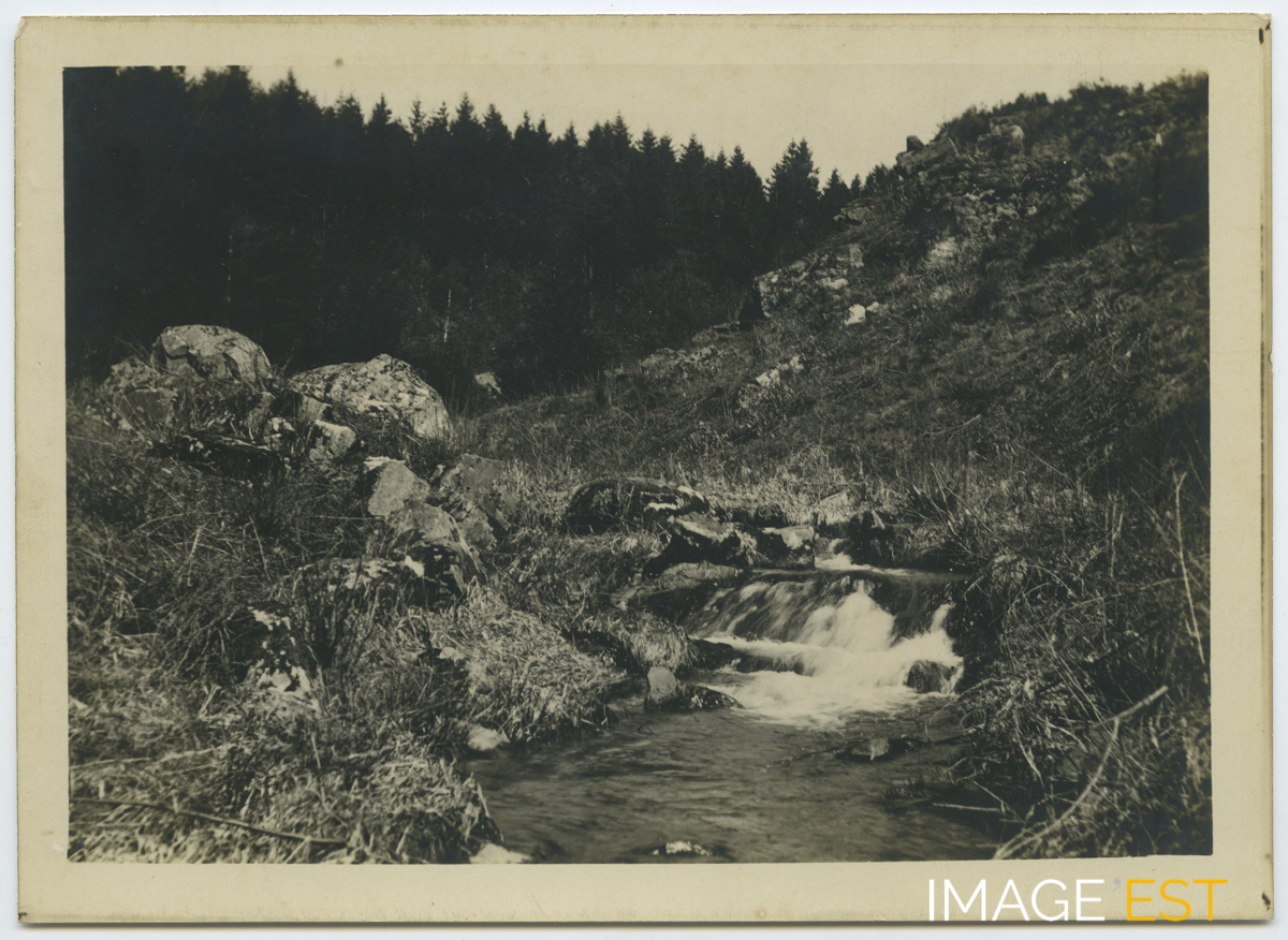 Chute d'eau en montagne probablement dans le département des Vosges. Cette photographie est extraite d'un album en cuir repoussé comprenant un ensemble de 48 photographies (format 13 x 18 cm), noir et blanc, illustrant les loisirs et la vie d'une famille aisée probablement dans le département des Vosges à la fin du XIXe ou au début du XXe siècle.