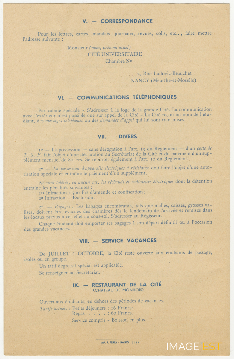 Règlement intérieur de la Cité universitaire et château de Monbois 2, rue Ludovic Beauchet à Nancy (Meurthe-et-Moselle).