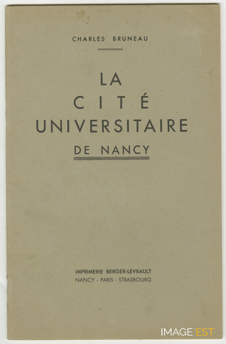 Couverture d'un livret de présentation de la Cité universitaire de Monbois 2, rue Ludovic Beauchet à Nancy (Meurthe-et-Moselle) par Charles Bruneau, professeur à la Faculté de Lettres de Nancy.
