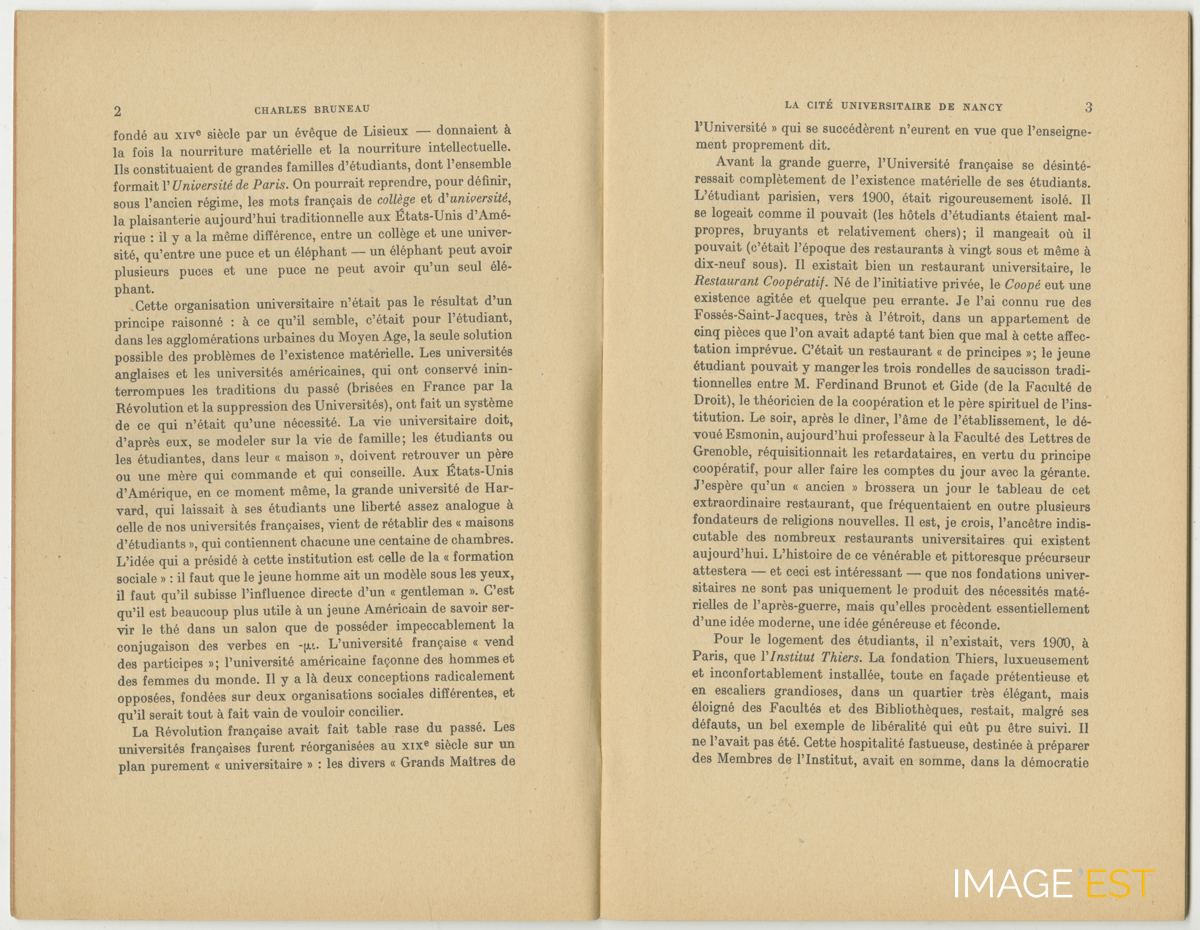 Texte extrait d'un livret de présentation de la Cité universitaire de Monbois 2, rue Ludovic Beauchet à Nancy (Meurthe-et-Moselle) par Charles Bruneau. L'auteur évoque les conditions de logement et de restauration des étudiants vers 1900 à Paris sous l'égide du " Restaurant coopératif " et de " l'Institut Thiers ".