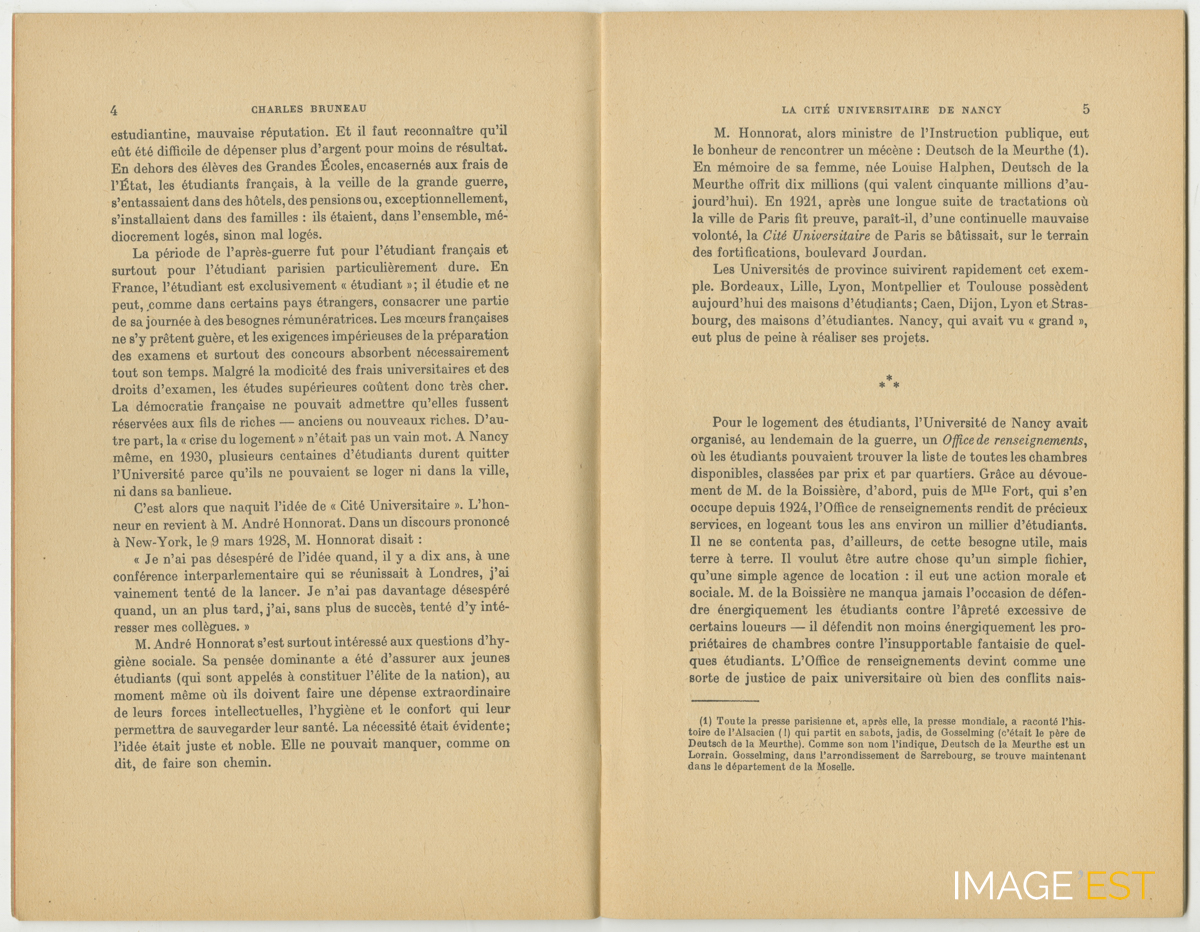 Texte extrait d'un livret de présentation de la Cité universitaire de Monbois 2, rue Ludovic Beauchet à Nancy (Meurthe-et-Moselle) par Charles Bruneau. L'auteur évoque les conditions de vie des étudiants après la Première Guerre mondiale. À Nancy, en 1930, plusieurs centaines d'étudiants durent quitter l'Université faute de logement. C'est alors que naquit l'idée d'une " Cité universitaire " dont le principe en revient à M. André Honnorat, alors ministre de l'Instruction publique qui eut le bonheur de rencontrer un mécène alsacien, Deutsch de la Meurthe, qui offrit dix millions à ce projet. En 1921, une cité universitaire voyait le jour à Paris. L'exemple fut suivi à Bordeaux, Lille, Lyon, Monpellier et Toulouse. Pour d'autres villes, Caen, Dijon, Lyon et Strasbourg, des maisons d'étudiants pourvoyaient aux besoins. Nancy devait attendre encore quelques années. Au lendemain de la guerre, un Office de renseignements rendit les services de recherche de logements.