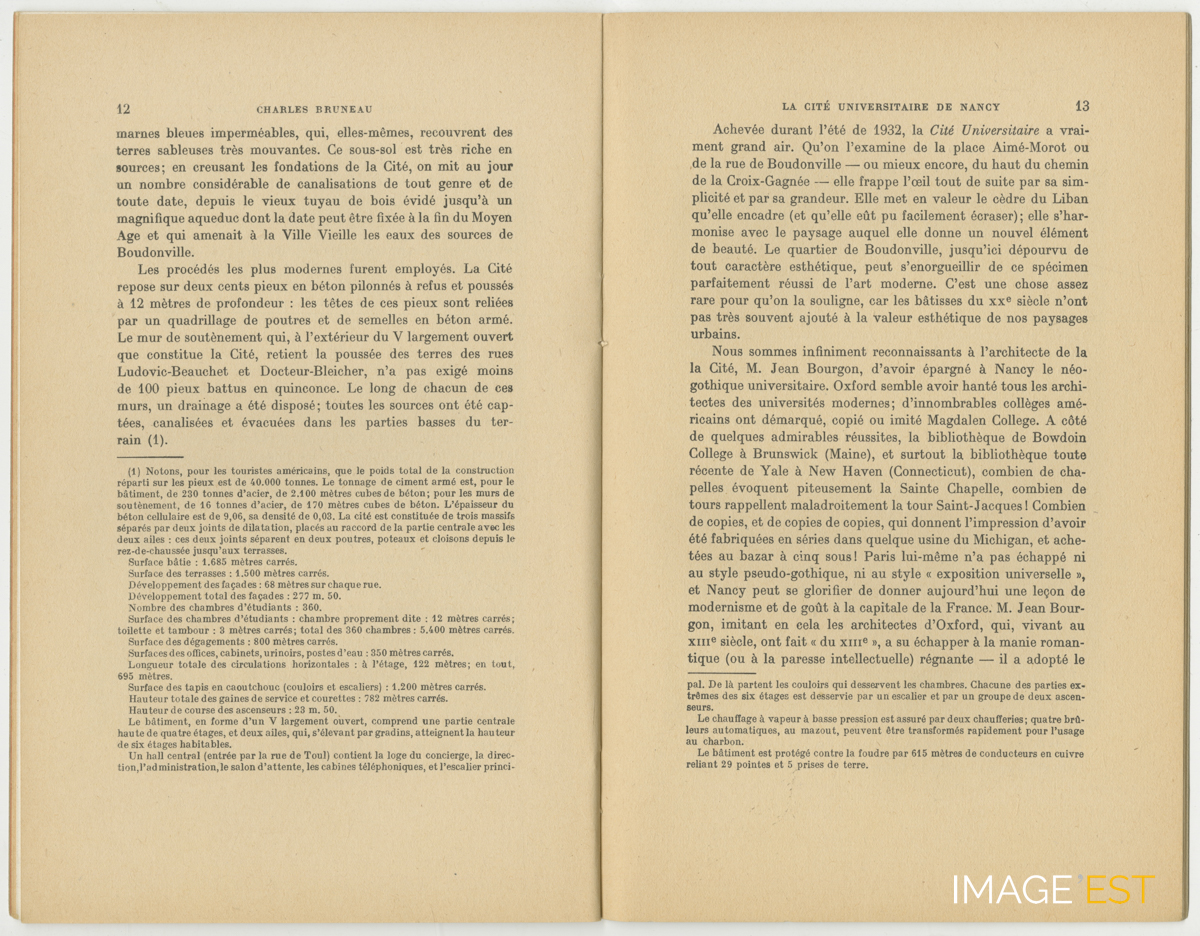 Textes extraits d'un livret de présentation de la Cité universitaire de Monbois 2, rue Ludovic Beauchet à Nancy (Meurthe-et-Moselle) par Charles Bruneau. L'auteur évoque les travaux dans l'ancien parc du château de Monbois durant lesquels furent découverts une vieille canalisation de bois et un aqueduc datant de la fin du Moyen Âge qui amenait à la Ville Vieille les eaux des sources de Boudonville. Les travaux sont achevés durant l'éte 1932 sur les plans de l'architecte Jean Bourgon.