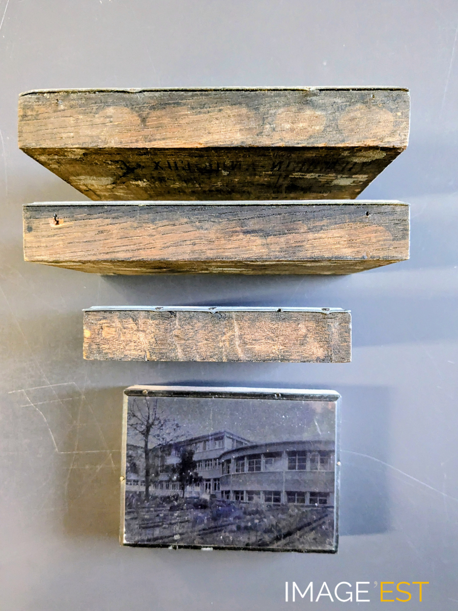 Ensemble de quatre clichés typographiques (similigravures pour reproduire mécaniquement une photogravue) pour impression une couleur (noir en général) sur presse typo. Ils sont composés de blocs de bois et d'une plaque métallique (en général du zinc) clouée sur le bois. La surface est constituée d'une trame très fine (petits points en relief) que l'on peut ressentir en passant un ongle ou discerner avec un compte-fil. La fabrication des clichés typographiques relève du travail du photograveur : la plaque métallique dont la surface est enduite d'une couche sensible est insolée au travers d'un négatif tramé de l'image à reproduire. Un dépouillement chimique gravera la plaque en une trame de points qui rendront, du blanc au noir, toutes les nuances de gris de la photographie à reproduire. Encrage et impression donnaient une reproduction non argentique pour la presse et l'édition avant la venue de l'offset. Les clichés étaient intégrés aux textes (caractères plomb). Les clichés représentent l'ancienne École supérieure de Pharmacie, rue de la Ravinelle à Nancy et des salles de laboratoire ou d'atelier.