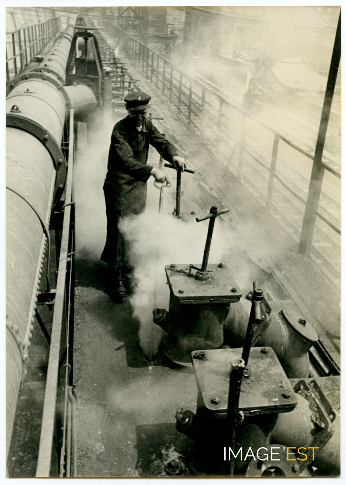 Extraction de matières premières précieuses et combustibles par l'élimination des composants volatils du charbon au sein de de l'usine de sous-produits d'une cokerie de la Sarre (Allemagne). Au verso de cette photographie, le cachet d'un photographe : " Dr Wolff & Tritschler Frankfurt am Main ". Paul Wolff (1887-1951) et Alfred Tritschler (1905-1970) sont deux photographes allemands, connus autour des années 1930 et considérés aujourd'hui par le milieu de la photographie comme les pionniers de l'usage de l'appareil photo Leica. (https://www.afcinema.com/Exposition-Paul-Wolff-et-Alfred-Tritschler-aventuriers-du-Leica.html)