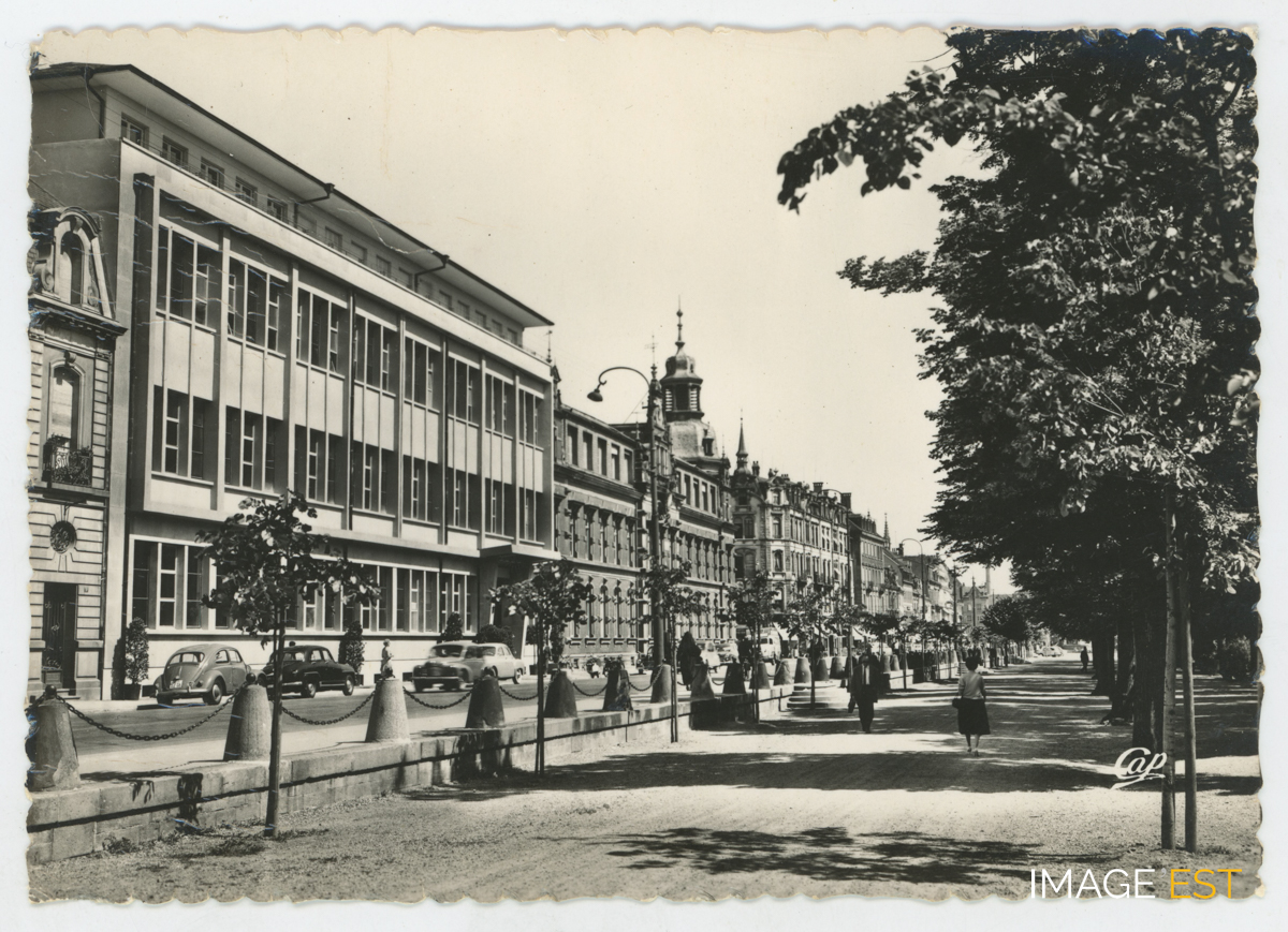 Avenue de Colmar (Alsace) avec le bâtiment du Champ-de-mars de la grande poste et l'extension moderne construite en 1972 .