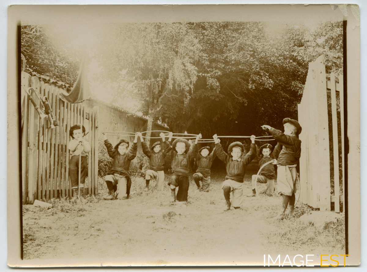 Groupe d'enfants effectuant des exercices de cerceaux lors d'une colonie de vacances à Sion (Meurthe-et-Moselle), en août 1908. Une mention manuscrite au verso de cette photographie précise : " M. - tiré par Henri - Sion - août 1908 - à la colonie de vacances - Exercices de cerceaux - Notre dame de Sion (54) - E ".