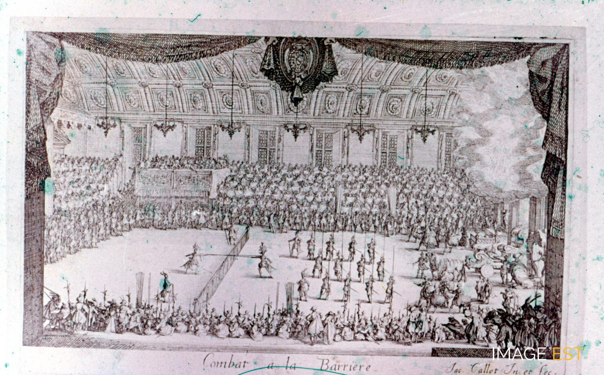 Jacques Callot (1593-1635), témoin de son temps (2e série). Estampe de Jacques Callot (1619 1628) représentant deux personnages s'affrontant avec une lance au-dessus d'une barrière devant de nombreux spectateurs. En marge de la diapositive figure la mention : " 3. Le Combat à la Barrière (1627) ". Séries de diapositives sélectionnées et commentées par Jean Hurstel, directeur du Service éducatif des Musées de l'Académie de Nancy-Metz.