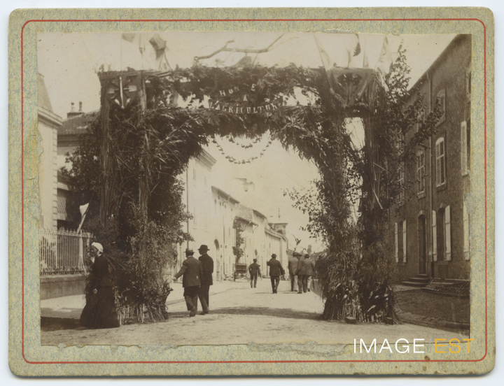 Porte monumentale en branchage portant l'inscription " Honneur à l'agriculture ", érigée dans une rue à Gerbeviller (Meurthe-et-Moselle) à l'occasion d'un comice agricole vers 1900.
