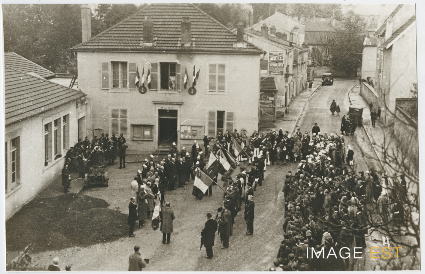 Commémoration de l'Armistice par les anciens combattants place de l'ancienne mairie en 1931 à Maxéville (Meurthe-et-Moselle).