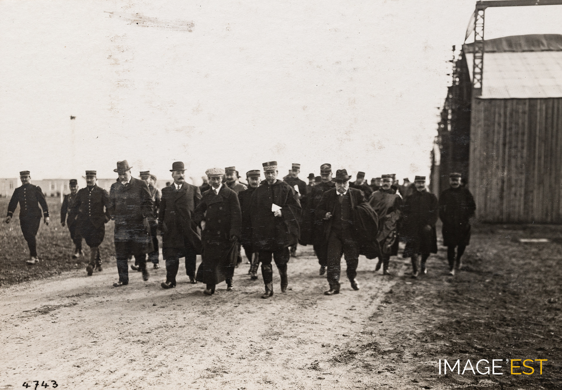 Arrivée des officiels de l'Armée et de l'État sur le terrain d'aviation de l'aérodrome de la Champagne à Reims (Marne) lors du Concours d'aviation militaire en octobre et novembre 1911. Une mention manuscrite en marge de cette photographie précise : " Concours militaire septbre - novbre 1911 ". C'est à l'instigation du général Roques dirigeant l'Inspection permanente de l'aéronautique militaire et du colonel Hirschauer, responsable des Services techniques aéronautiques de l'Armée qu'est organisé ce concours d'aéroplanes. Il s'agit d'imposer aux constructeurs un cahier des charges appropriés aux besoins spécifiques de l'armée et de l'État. Des primes sont prévues pour récompenser les meilleurs, ainsi que des commandes de l'État. Trentes aéroplanes sont admis à concourir, sur des critères très exigeants : l'appareil doit être de fabrication française, pouvoir transporter trois personnes, faire 300 km sans escale avec 300 kg de charge utile, voler au moins à 60 km/h, être facilement démontable. C'est un Nieuport qui remporte le concours, suivi des Bréguet et Deperdussin (Le grand concours