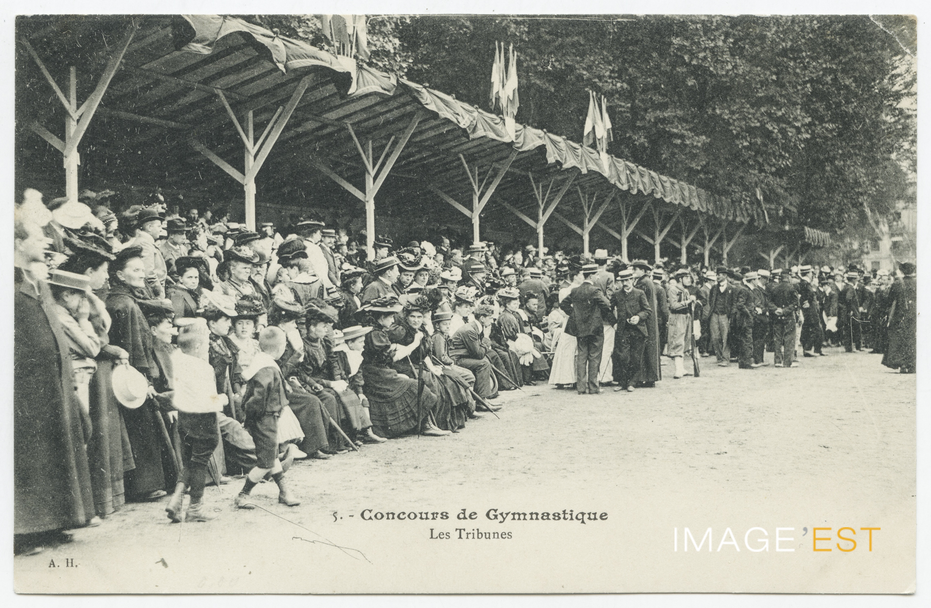Les tribunes au parc de la Pépinière à Nancy (Meurthe-et-Moselle) lors du Concours de gymnastique du 23 juin 1907.