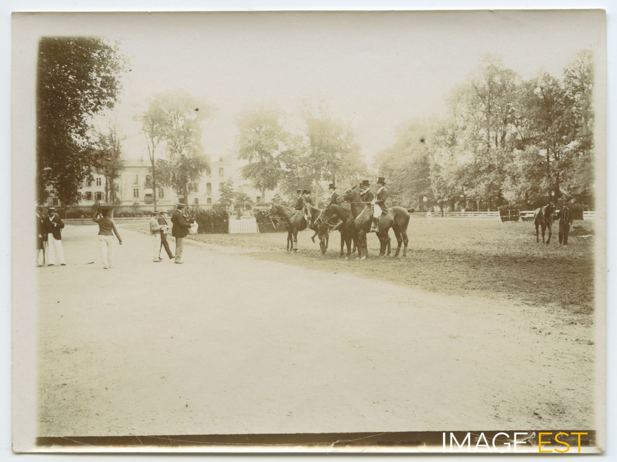 Concours hippique au parc de la Pépinière à Nancy (Meurthe-et-Moselle), le 26 mai 1904. Une mention manuscrite au verso de cette photographie précise : " J.Z. N° 375 - 26 mai 1904 - Concours hippique - Les chevaux primés (vers 5 h) - 1er prix 400 F - Lamina à Mr Villemarest - 2e - 200 F - Jubilée à Mr Carl Wagner - 3e - 100 - Carolin à Mr H Le Coul[?] - 4e - 100 - Le diable à vicomte G. de Saint Seine - vers 5 h - temps un peu couvert - D = 0 - I 1/20 - 47 - E ".