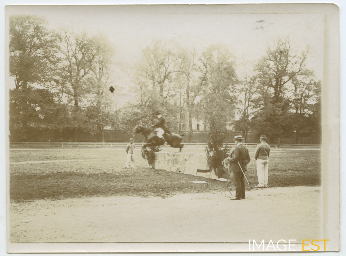 Concours hippique au parc de la Pépinière à Nancy (Meurthe-et-Moselle), le 26 mai 1904. Une mention manuscrite au verso de cette photographie précise : " J.Z. N° 371 - 26 mai 1904 - Concours hippique - Habits rouges - Saut du mur - (a) (N° 12) Feuille de rose au vicomte G. de Saint Seine - j.bai - vers 3 h - temps un peu couvert - D = 0 - I = 1/64 - 49 - E ". Présence de mentions manuscrites rayées.