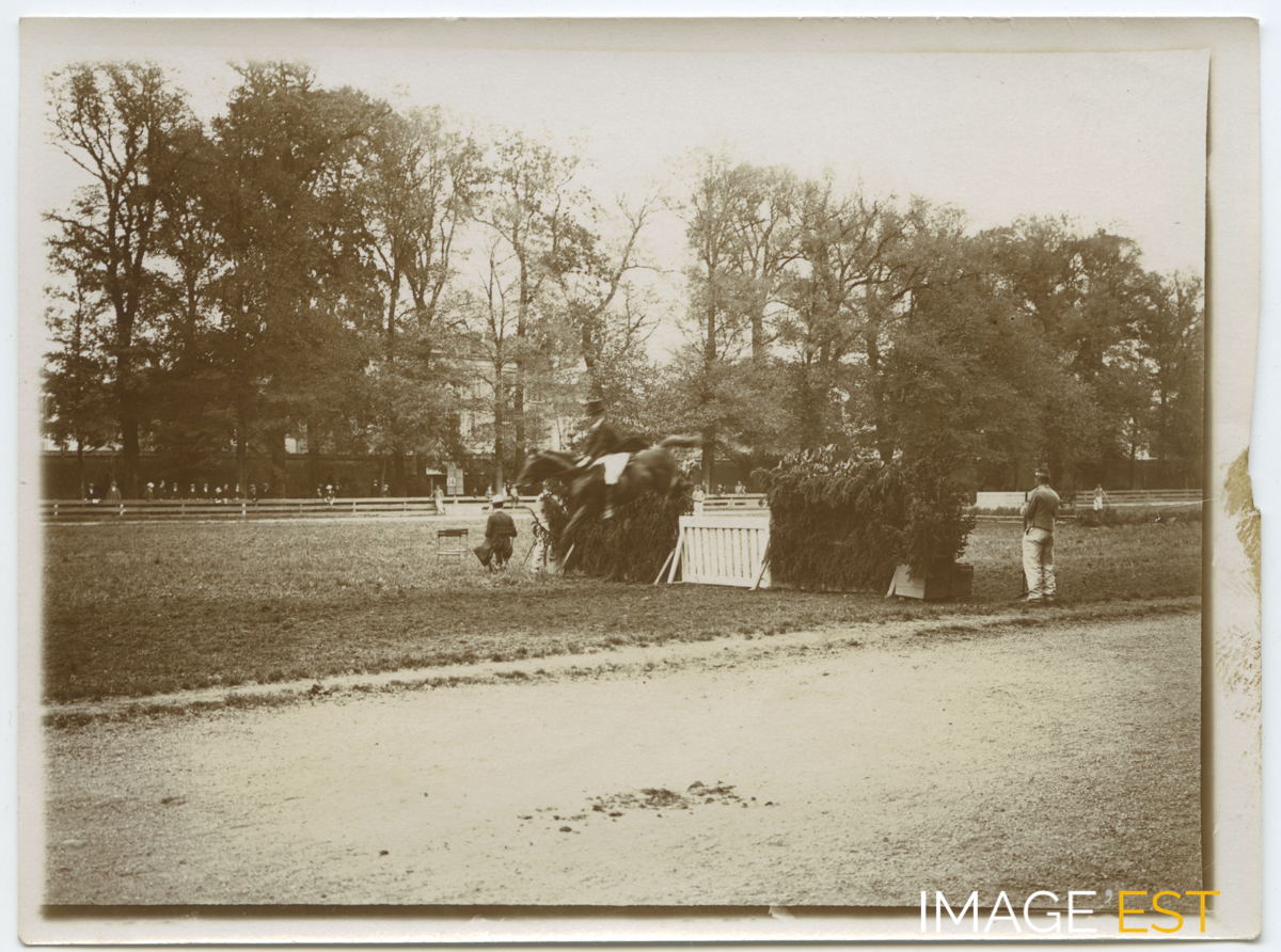 Concours hippique au parc de la Pépinière à Nancy (Meurthe-et-Moselle), le 26 mai 1904. Une mention manuscrite au verso de cette photographie précise : " J.Z. N° 372 - 26 mai 1904 - Concours hippique - Habits rouges - Saut de la barrière de champs - (b) N° 14 Voilier à Legendre p. Marquis de Bellefond - ch. bai - vers 3 h - temps un peu couvert - D = 0 - I 1/64 - 50 - E ".