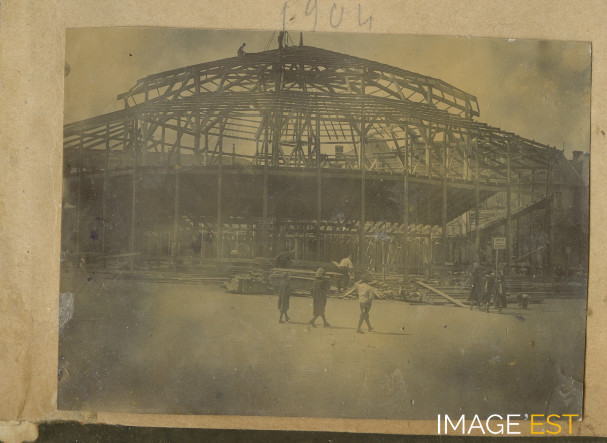 Construction d'une rotonde probablement place Carnot à Nancy (Meurthe-et-Moselle). Il pourrait s'agir de la charpente d'un cirque (Plège).