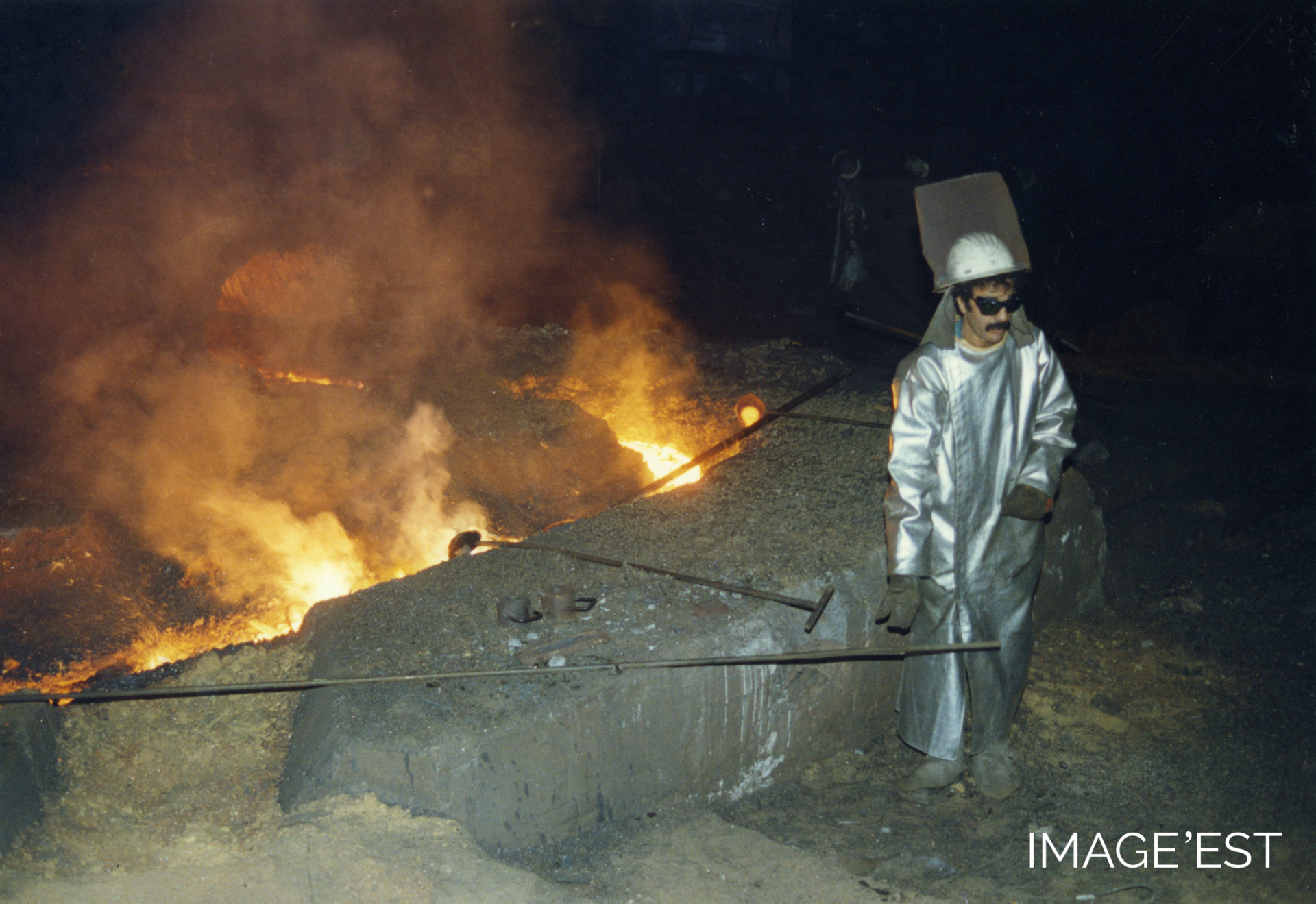 Le sidérurgiste a préparé les moules à échantillons à des fins d'analyses. Haut-fourneau U1 de l'usine Lorfonte de Uckange (Moselle) le 16 décembre 1991.
