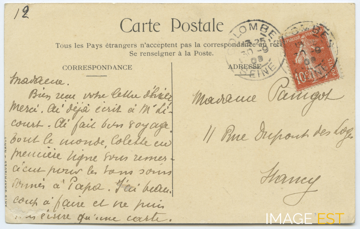 Carte postale adressée à madame Panigot 11, rue Dupont des Loges Nancy (Meurthe-et-Moselle) avec les remerciements de Paul Pattinger.