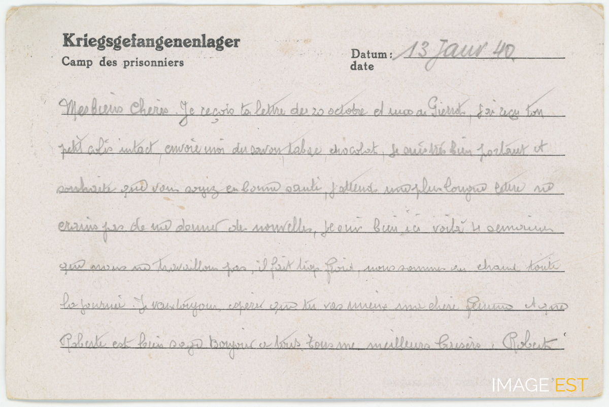 Correspondance de M. Robert Haxaire (n°36326), prisonnier de guerre au Stalag XVII B (Allemagne), datée du 13 janvier 1940 et adressée à Mme Haxaire à Fraize (Vosges).