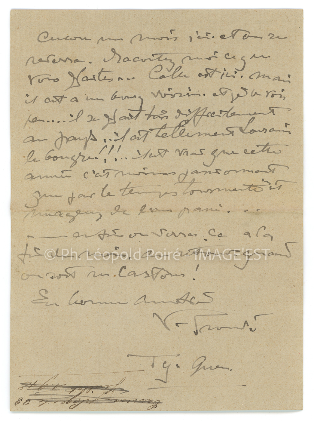 Correspondance écrite de Carnac (Morbihan) le 30 août 1913 par Victor Prouvé (1858-1943) à Léopold Poiré (1879-1917), résidant au 8, rue Saint-Julien à Nancy, dans laquelle V. Prouvé évoque ses vacances et livre quelques réflexions sur l'eau-forte à L. Poiré. La page précédente existe sous la cote FI-0574-2592.