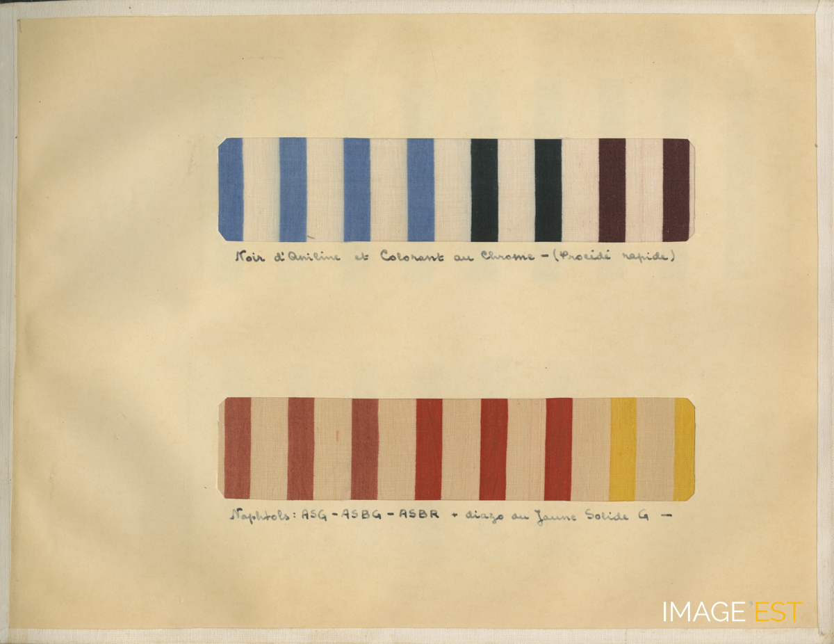 Cette planche est extraite de l'album intitulé " Teintures - Impressions, J. S. Dahl ", issu des collections de l'École nationale supérieure des industries chimiques (ENSIC) à Nancy (Meurthe-et-Moselle). L'accent est porté sur deux couleurs " Noir d'aniline et colorant au chrome - (procédé rapide) - Naphtols : ASG- ASBR ) diazo au jaune solide G " qui ressortent de deux morceaux de tissus. morceaux de tissus.