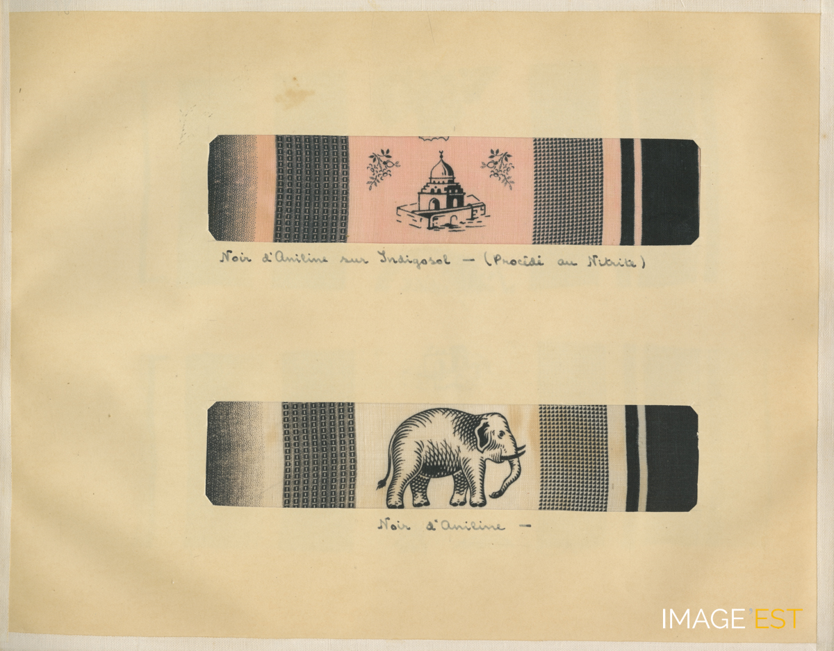 Cette planche est extraite de l'album intitulé " Teintures - Impressions, J. S. Dahl ", issu des collections de l'École nationale supérieure des industries chimiques (ENSIC) à Nancy (Meurthe-et-Moselle). L'accent est porté sur deux couleurs " Noir d'aniline sur indigosol - (procédé au nitrite) - Noir d'aniline ) diazo au jaune solide G " qui ressortent de deux morceaux de tissus illustrés de dessins.