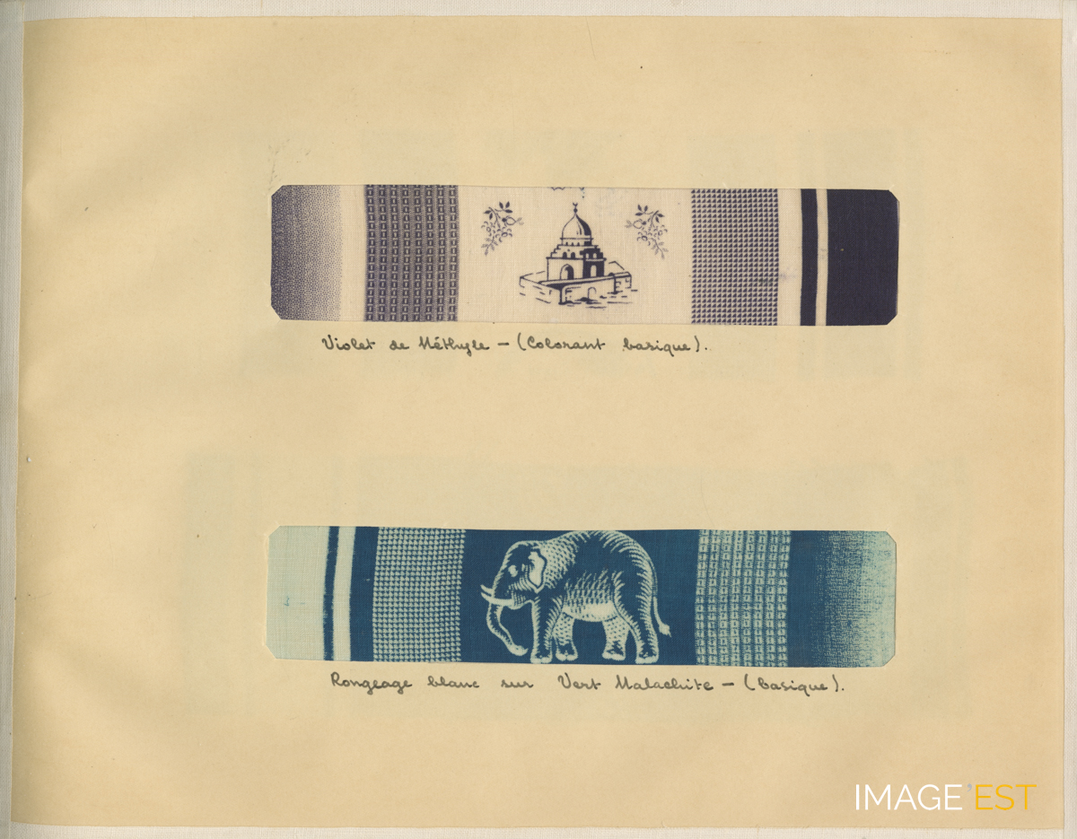 Cette planche est extraite de l'album intitulé " Teintures - Impressions, J. S. Dahl ", issu des collections de l'École nationale supérieure des industries chimiques (ENSIC) à Nancy (Meurthe-et-Moselle). L'accent est porté sur deux couleurs " Violet de méthyle - (colorant barique) - Rongeage blanc sur vert malachite - (basique) " qui ressortent de deux morceaux de tissus illustrés de dessins.