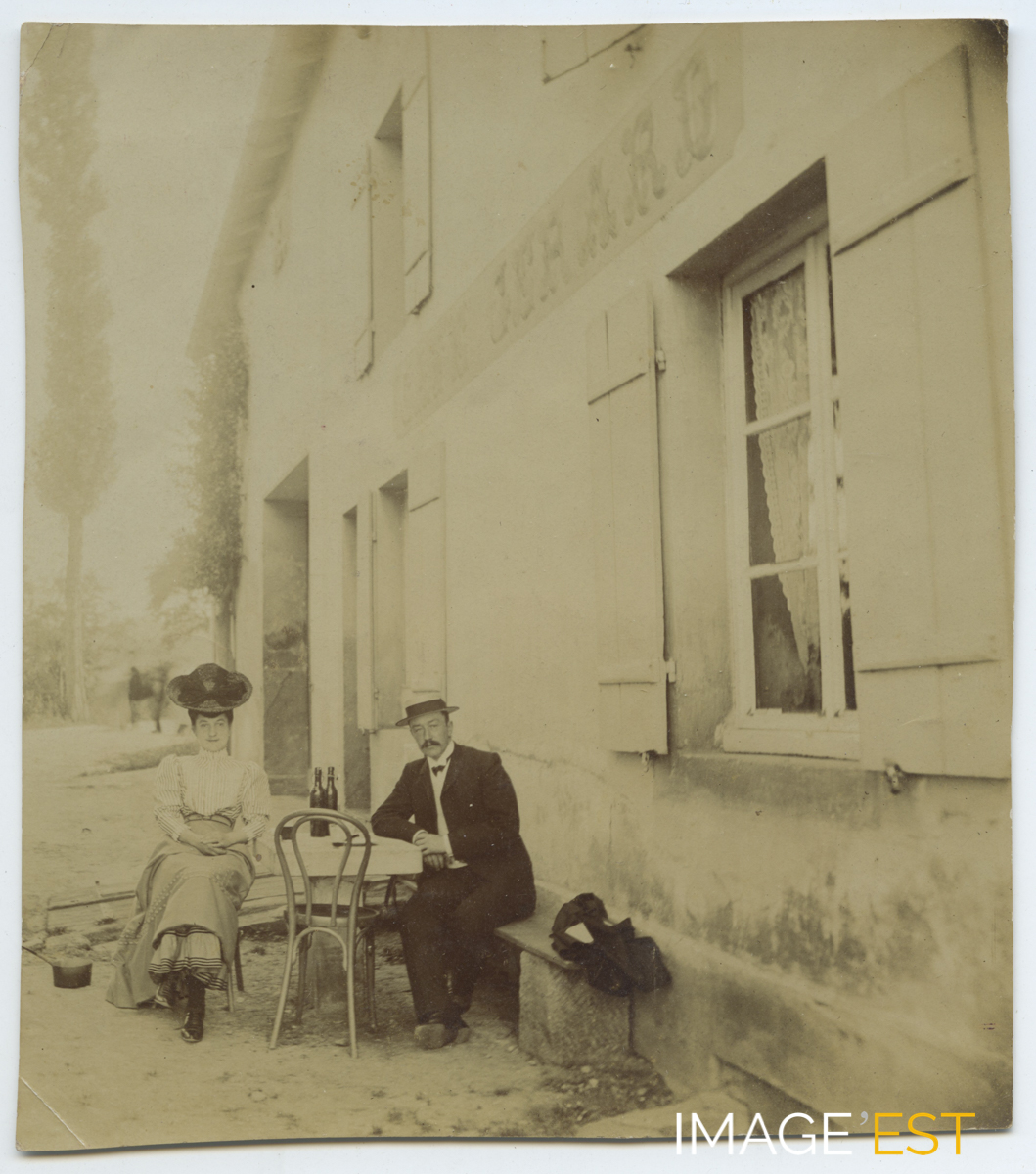 Couple attablé devant un café probablement dans le département des Vosges. Cette photographie est extraite d'un album en cuir repoussé comprenant un ensemble de 48 photographies (format 13 x 18 cm), noir et blanc, illustrant les loisirs et la vie d'une famille aisée probablement dans le département des Vosges à la fin du XIXe ou au début du XXe siècle.