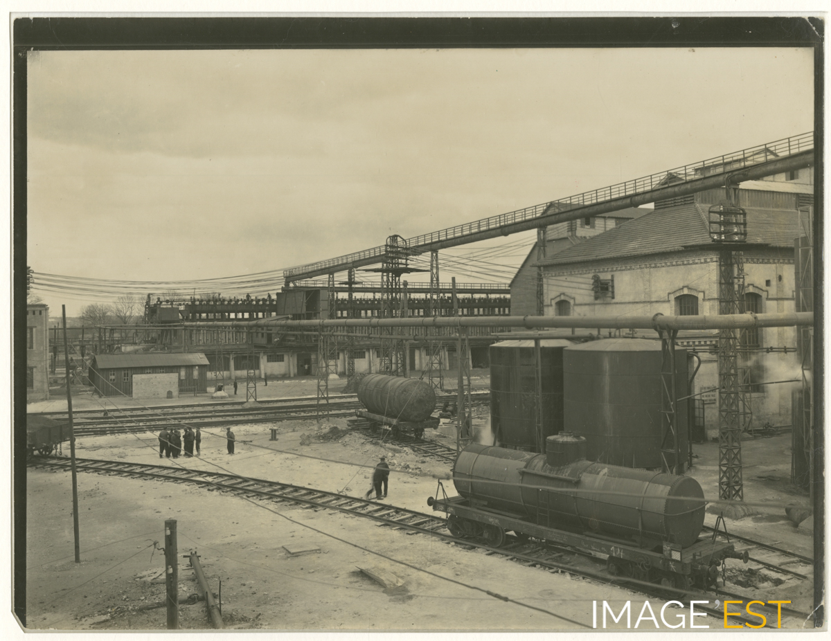 Wagon et voies de chemin de fer de la " Société des hauts-fourneaux et fonderies de Pont-à-Mousson " à Pont-à-Mousson (Meurthe et Moselle).