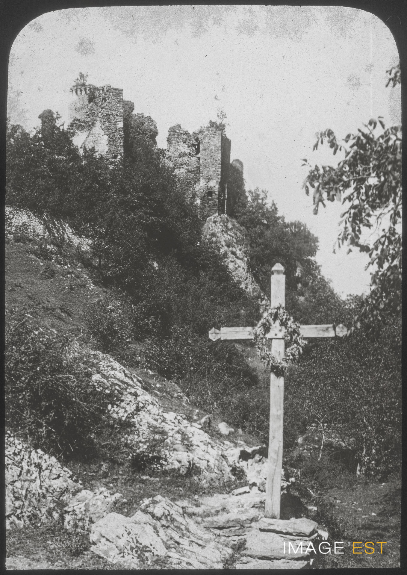 Croix de chemin devant les ruines du château de Beaucens (Hautes-Pyrénées). Une mention manuscrite en marge de la plaque de verre indique : " Ruines du château de Beaucens. "