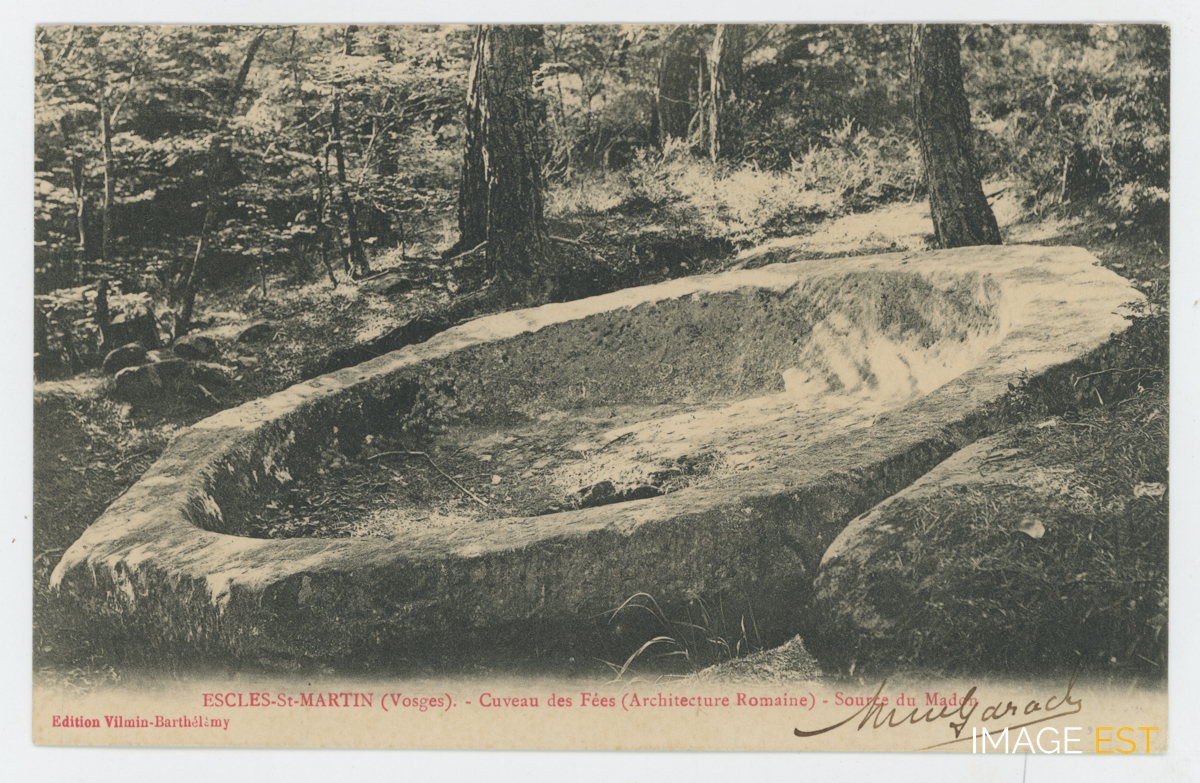Cuve octogonale taillée dans un bloc de grès à Escles (Vosges). D'après une légende populaire, celle-ci aurait été réalisée par des fées. Cette cuve se situe à proximité de la Chapelle et des grottes Saint-Martin. (Source : https://www.lieux-insolites.fr/vosges/cuveau/cuveau). Ce cuveau se situe à proximité de la source du Madon.