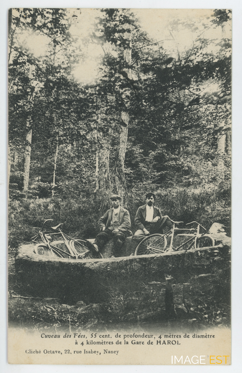Cuve octogonale taillée dans un bloc de grès à Escles (Vosges). D'après une légende populaire, celle-ci aurait été réalisée par des fées. Cette cuve se situe à proximité de la Chapelle et des grottes Saint-Martin. (Source : https://www.lieux-insolites.fr/vosges/cuveau/cuveau). Deux cyclistes se reposent à l'intérieur du cuveau. La légende mentionne : " Cuveau des fées, 55 cent. de profondeur, 4 mètres de diamètre - à 4 kilomètres de la gare de Harol ".