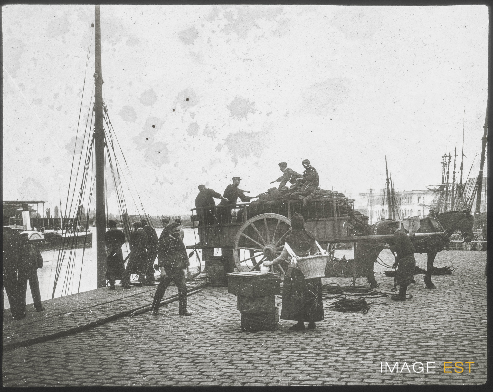 Déchargement de la cargaison d'un bateau, probablement à Anvers (Belgique).