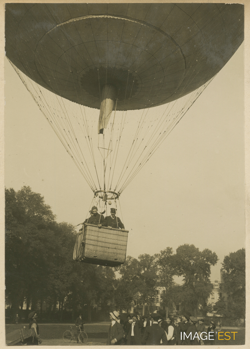 Décolage d'un ballon (voir article de L'Est Républicain du 5 octobre 1910) du parc de la Pépinière à Nancy (Meurthe-et-Moselle). Dans la nacelle, Louis Kalis (1874-1939) entrepreneur de travaux publics, Paul Moreau (1879-1933) brasseur et de face, Antonin Bergeret (1893-1983) étudiant. Au verso, une annotation manuscrite précise : " Lâcher tout -Adieux ! ". (Source : Archives privées des familles Kalis-Moreau).